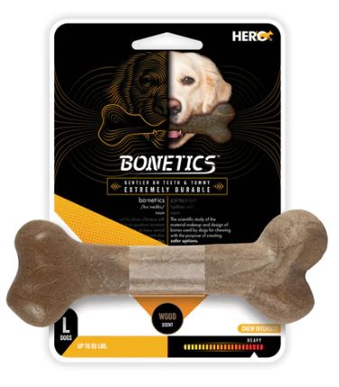 Introducing new Hero Bonetics™ dog chews! Hero Bonetics is the result of a two-year in-depth scientific study of the material, design, and production of dog chews. The goal? Create a safer dog chew that is extremely durable and great tasting! Our proprietary, real wood blended nylon material outlasts and outperforms other bones on the market, and dogs are unable to resist!