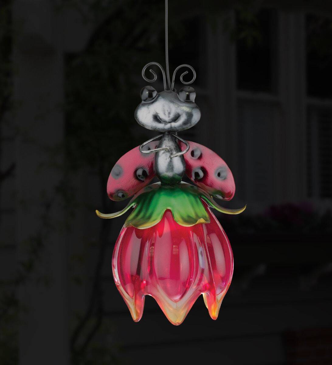 Whimsical garden characters adorn this mini solar lantern with an acrylic flower skirt. Solar powered LED lights illuminate the flower at night, creating a soft colored glow.
