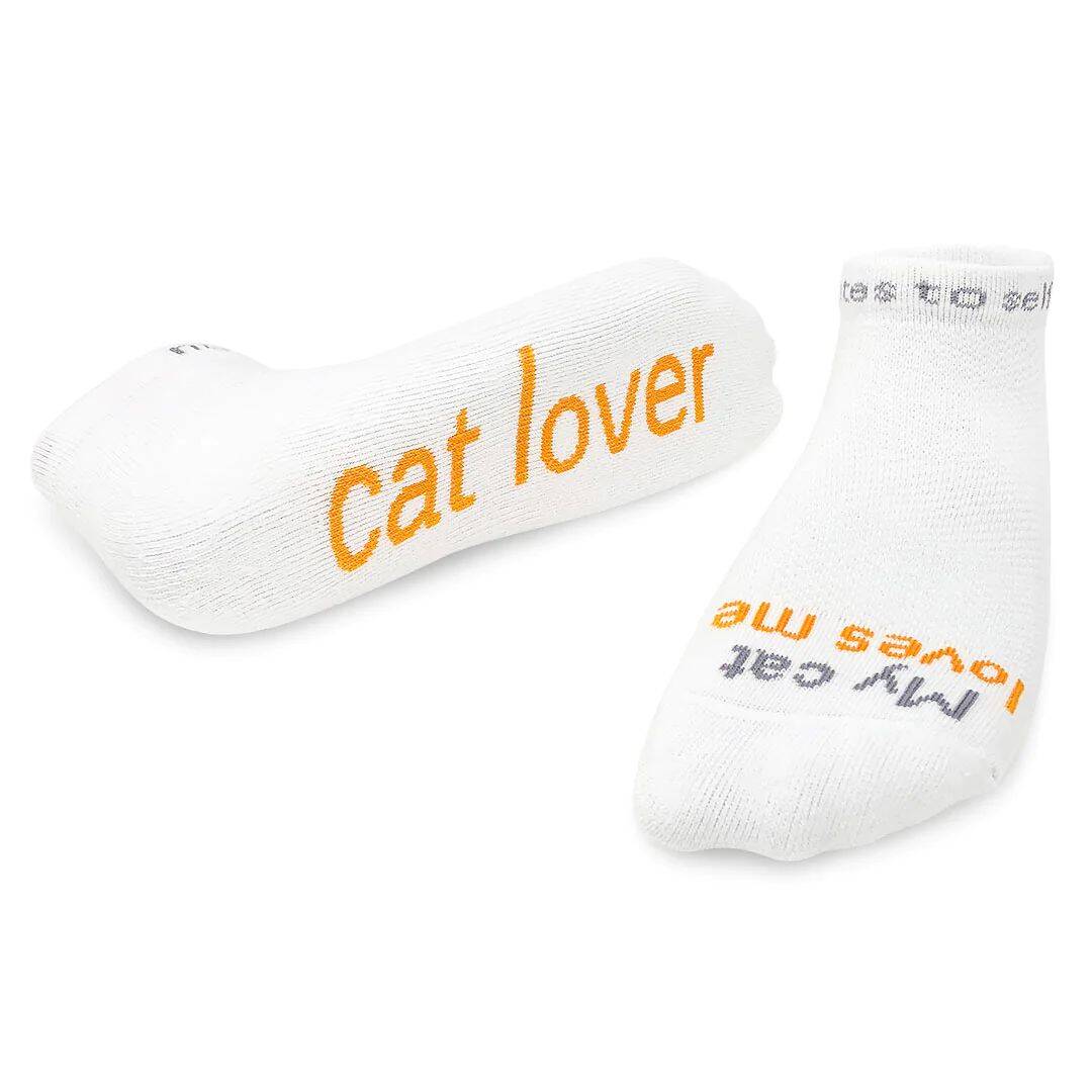 notes to self® 'My cat loves me – cat lover'™ white socks with light orange words. High quality athletic socks with arch support and breathable mesh. 72% cotton, 20% nylon, 6% polyester, 2% spandex. Machine wash cold, non-chlorine bleach only, tumble dry low. Makes a great gift for a pet lover. Made in the U.S.A.