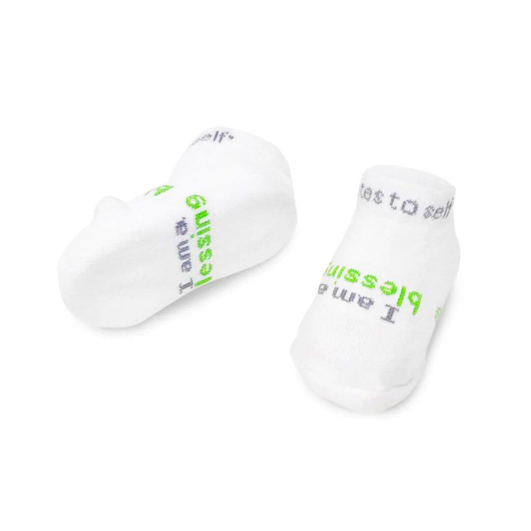 notes to self® 'I am a blessing'® sock for baby girls and boys. White socks with green words. Size infant 3-12 months. 72% cotton, 20% nylon, 6% polyester, 2% spandex. Machine wash cold, non-chlorine bleach only, tumble dry low. Made in the U.S.A.