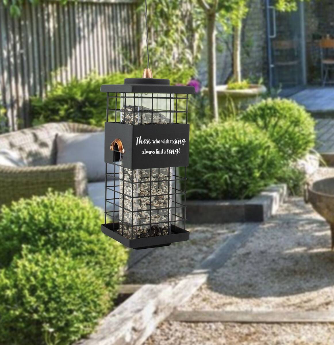 Motivational message embellishment enhances this Farmhouse styled seed feeder. The feeder has a squirrel and predator resistant cage to protect seed from larger birds. Metal 1½-in grid keeps larger birds and squirrels out! Generous sized plastic tube feeder holds 2 lbs. of mixed seed. The matte black powder coated finish and copper colored accents make this a winner for birds and bird watchers. Vented to keep seed fresh with a copper accent seed port. Cage provides plenty of perching space and the seed catcher bottom saves seed from being wasted. Metal cable included for hanging. Decorative and functional, a beautiful addition to any backyard or garden!