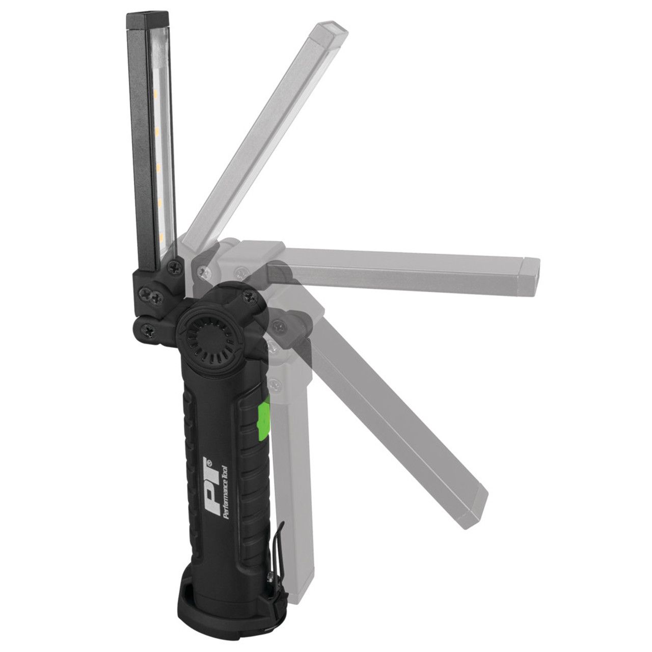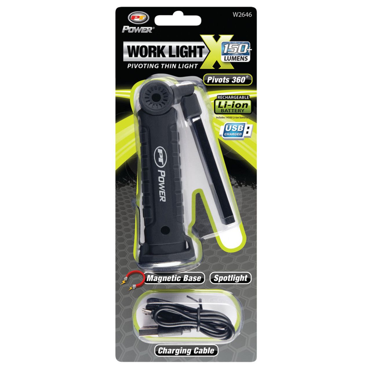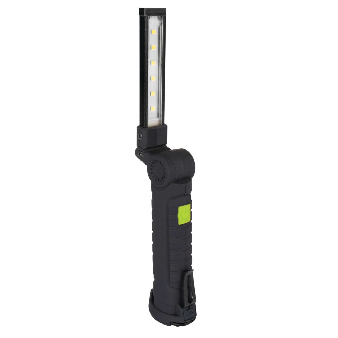 Double hinged light bar provides 360 degrees of light for precise illumination. Compact deign with thin, low profile light bar for access in confined areas. Features additional light at the tip, magnetic base, swivel hook and pocket clip. Integrated 14500 lithium-ion rechargeable battery (USB cord included).