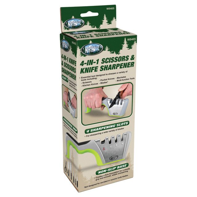 Essential tool designed to sharpen a variety of tools including pocket knives, scissors, machetes, kitchen knives, multi-function tools, blades and more*. Features 4 slots: Slot 1 features a notched tungsten steel blade to sharpen scissors. Slots 2, 3 and 4 offer 3-stage knife sharpening for restoring your blade to a precision edge. Slot 2 has dual tungsten blades for grinding away dulled edges; Slot 3 has hardened emery rods to smooth and sharpen rough edges; Slot has 4 ceramic rods to deliver a polished, sharp blade. Non-Slip rubber base creates a firm foundation for a steady grip and smooth, stable sharpening. Oversized grip gives you plenty of room to operate safely, and allows for increased stability. Instructions: 1. Position knife sharpener on a large, flat, cut-resistant surface. Use a protective layer if necessary. 2. Position knife sharpener where you can hold it firmly and securely in place. 3. Steadily run your dull knife blade about through slot, pulling the knife towards you. Repeat 3 or 4 times to expose a new edge. 4. Repeat in slot 2, and again in slot 3.