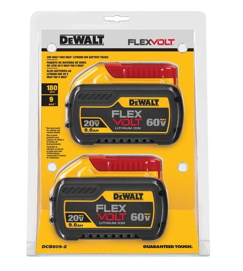 The dual-voltage FLEXVOLT® 20V/60V MAX* 9.0 Ah battery automatically changes voltage when you change tools, providing up to 6X runtime** (** With DCB609 FLEXVOLT® battery when used with DEWALT 20V MAX* tools compared to DCB201 1.5 Ah battery pack.) in 20V MAX* tools and the power of corded in 60V MAX* and 120V MAX* tools.