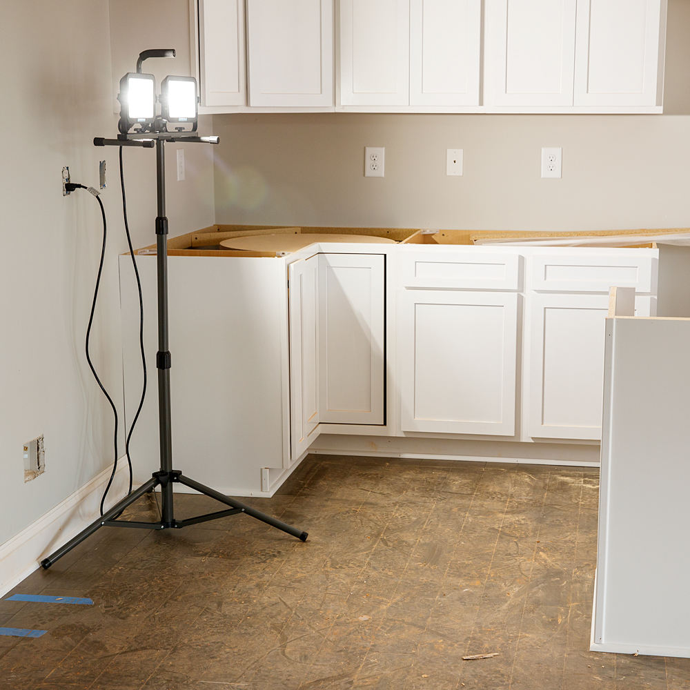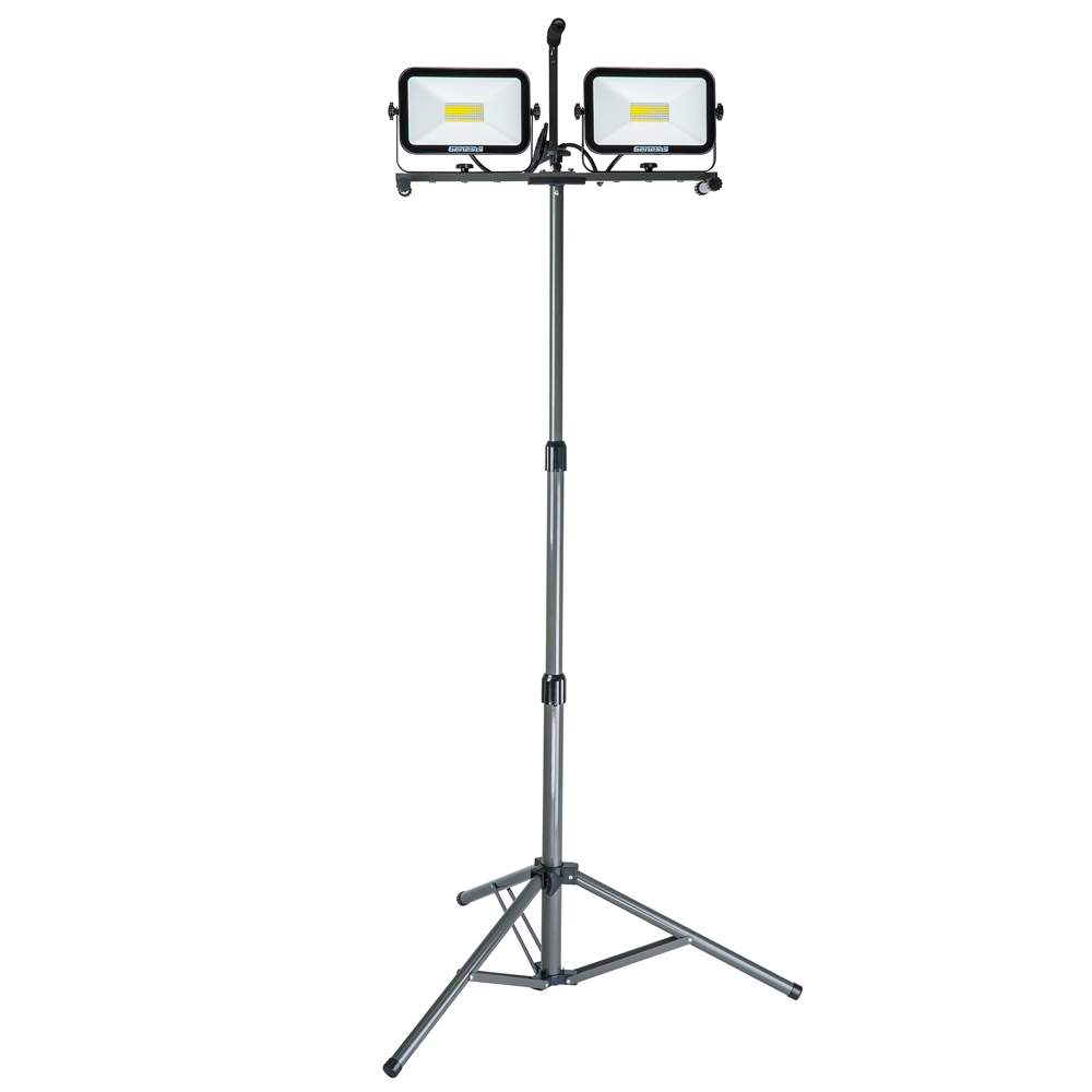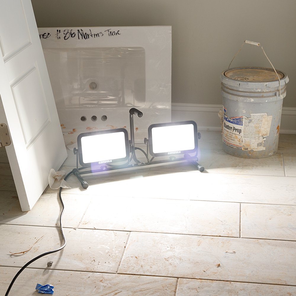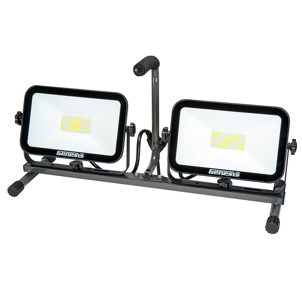 The Genesis 13,000-Lumen Dual-Head LED Work Light includes a heavy-duty telescoping tripod that extends up to 64 inch tall. The long-lasting, super-bright, impact resistant lights never need replacing and they detatch from the tripod for extra versatility. It has a sealed die-cast aluminum housing with a sealed on/off switch on each light.