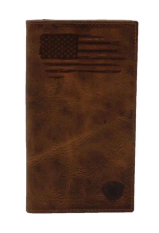 Distressed USA flag on the front with an Ariat shield logo stamped on bottom corner. It features multiple compartments for your credit cards, cash, and an ID window.