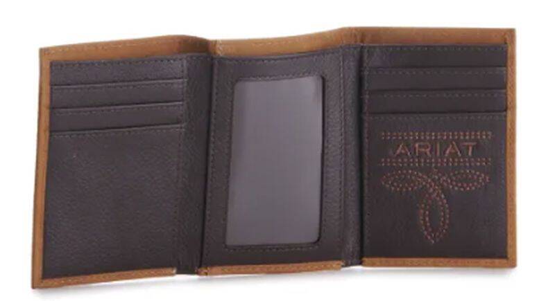 This Ariat brown top grain leather tri-fold wallet features an embossed flag on the front. It features heavy duty stitching, 6 card slots, protective ID window, and cash divider.