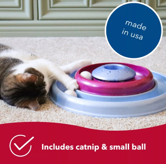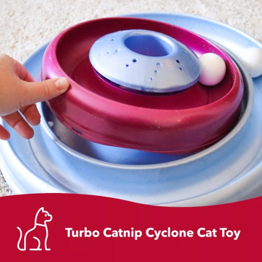 Cut the mess of catnip with the Turbo?« Catnip CycloneÔäó Cat Toy! The Cyclone holds catnip neatly in its center and generates steady air currents to waft the scent of catnip throughout the air. The air currents help amplify the energizing effects of catnip for your cat. The cyclone center sits within a round racetrack, making it a great toy to get your cat moving and playing Use as a standalone toy or add it to the Turbo Scratcher to create a Catnip Hurricane. To use with the Turbo Scratcher, simply insert the Cyclone into the Scratcher or Star Chaser toys. Bring home the Cyclone for your cat today!