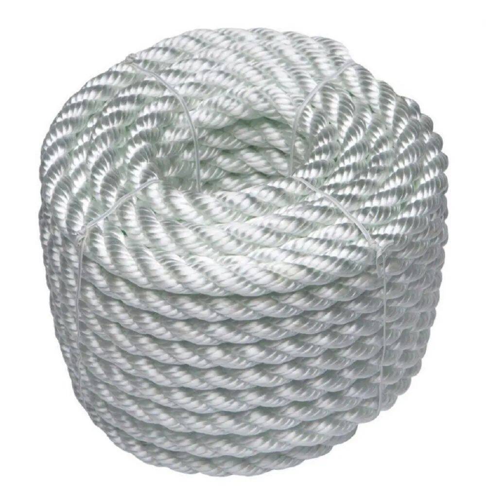 This white nylon twisted rope has a diameter of 1/2 in. It is ideal for lifting, towing, tying down, anchoring, and docking.