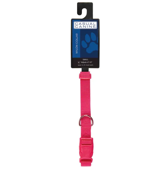 Casual CanineĀ® Nylon Dog Collars are durable and fashionable basics. Each dog collar features a plastic quick-release buckle and a nickel-plated D-ring for leash attachment.