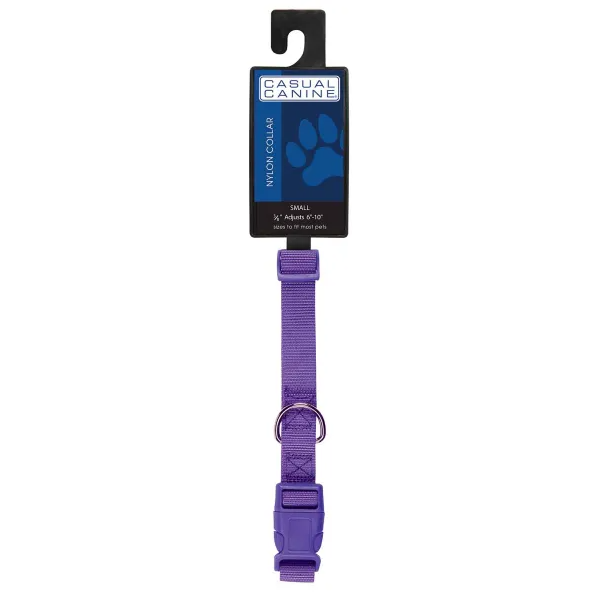 Casual CanineĀ® Nylon Dog Collars are durable and fashionable basics. Each dog collar features a plastic quick-release buckle and a nickel-plated D-ring for leash attachment.