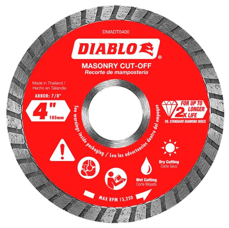 Diablo's diamond turbo masonry cut-off discs provide extreme durability and longer life in concrete, brick and cinder block applications. These continuous rimmed diamond discs deliver up to 2X longer cutting life versus standard diamond cut-off discs. The disc's industrial-grade diamonds coupled with a hardened disc body delivers lasting durability and maximizes cutting quality in hardened materials even in extreme applications.