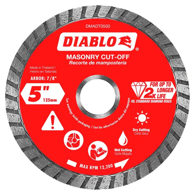 Diablo's diamond turbo masonry cut-off discs provide extreme durability and longer life in concrete, brick and cinder block applications. These continuous rimmed diamond discs deliver up to 2X longer cutting life versus standard diamond cut-off discs. The disc's industrial-grade diamonds coupled with a hardened disc body delivers lasting durability and maximizes cutting quality in hardened materials even in extreme applications.