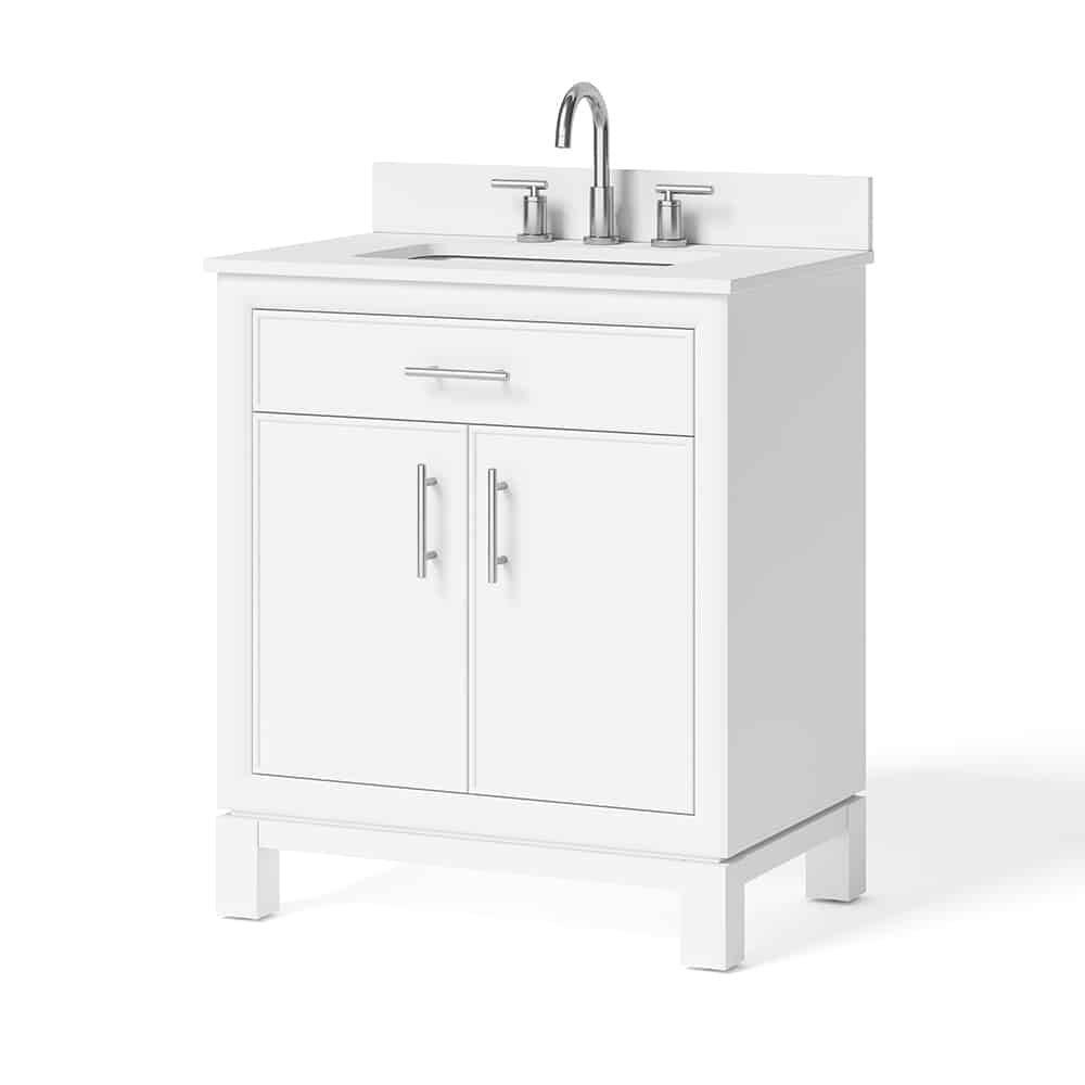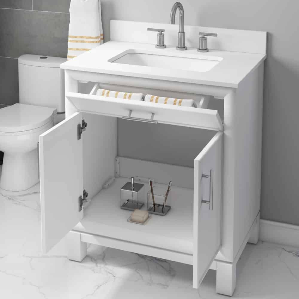 The product features a traditional design enhanced. The white vanity showcases its quality and style, hardware, and soft-close hinges and glides. The vanity includes an engineered jazz top and a vitreous China under-mount sink.