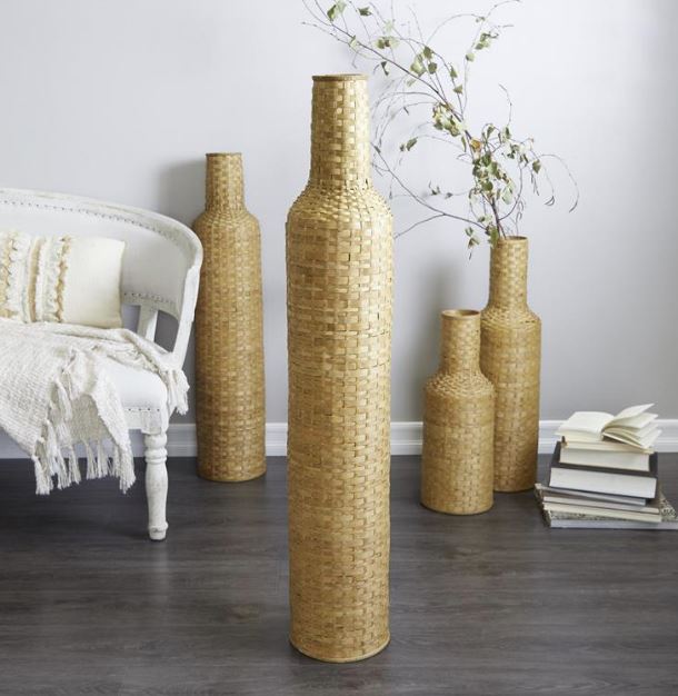 A boho inspired style that exudes creativity with a free-spirited design. Cylinder vase is crafted with a bamboo wicker body for an intriguing and durable design. Decorative floor vase features shades of natural brown wood to highlight the weave pattern design. Tall vase profile and textured design allows for versatility in the home and looks stunning on its own, or filled will long dramatic stems.