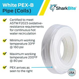 SharkBite PEX pipe is a cost-effective piping solution approved for use in both hot and cold plumbing installations. Compared to rigid pipe, PEX pipe is faster to install and its flexibility to bend around corners allows for longer runs and fewer connections - reducing cost, time and potential leak points. It is also a freeze resistant pipe that can expand slightly if frozen and contract when thawed. SharkBite PEX pipe offers the highest rating for chlorine resistance and a six-month UV resistance, the highest available. It is approved for water service lines and burial applications, including being buried in concrete. With more than 850 million feet of PEX pipe installed in North America, SharkBite PEX pipe is proven and guaranteed.