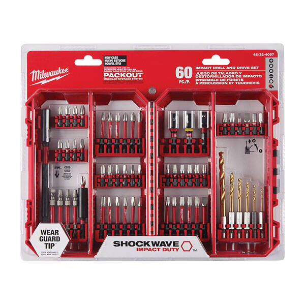 Our Milwaukee® SHOCKWAVE™ Impact Duty™ 60-piece drill and drive set is engineered to be the most durable, better fitting driver bits on the market. The WEAR GUARD TIP™ delivers increased wear resistance which protects the impact bit's fit over the life of the bit. The SHOCK ZONE™ is optimized for each tip type and length of driver bit in the set to absorb peak torque and prevent breaking. The driver bits are made from CUSTOM ALLOY76™ steel and a proprietary heat treatment process to extend bit life, providing up to 50X life versus other impact driver bits on the market. The Milwaukee® SHOCKWAVE™ Impact Duty™ driver bits are built to provide users with extreme durability for the most demanding applications. Set is organized in a customizable accessory case designed for use in PACKOUT™.