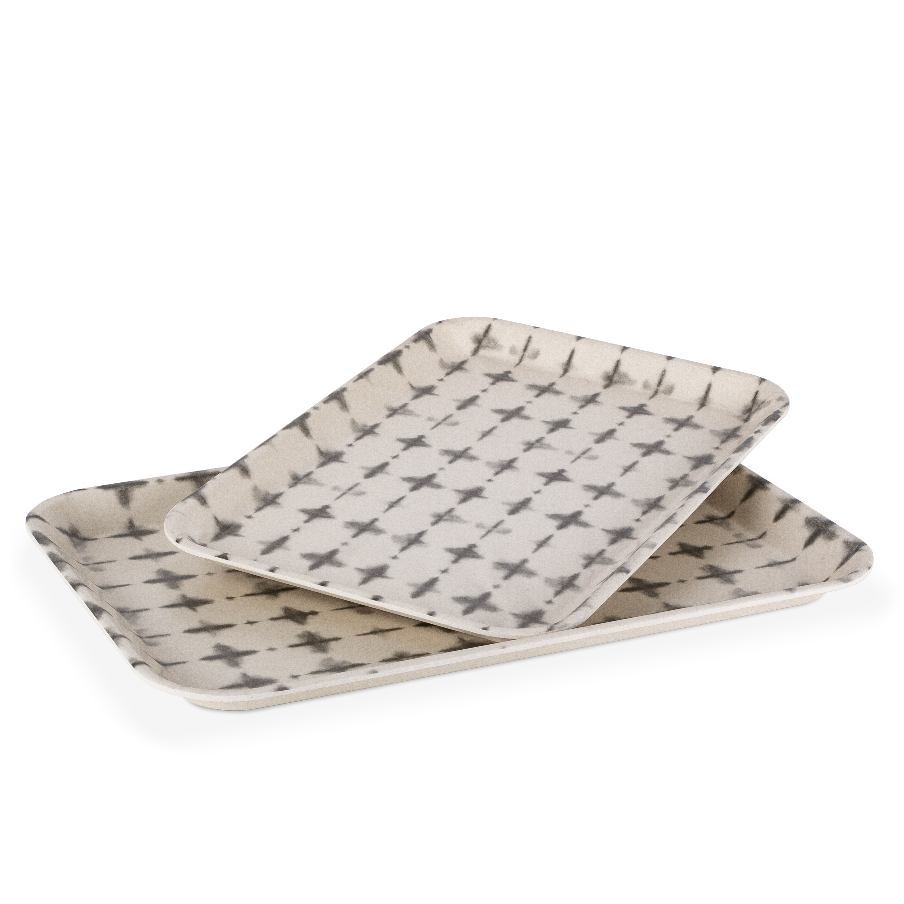 Set of 2 Black & White, Faded X Design, Bamboo Fibre Rectangle Tray. Large: 15.35"L x 10.63"W x 0.59"H, Small: 13.38"L x 9.05"W x .59"H.