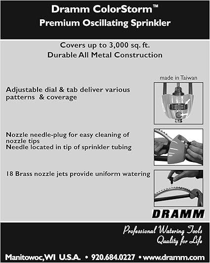 The ColorStorm Oscillating Sprinkler has 18 brass nozzle jets to provide uniform watering and includes a needle-plug for easy cleaning of the nozzle jets. The adjustable dial and tab deliver various water patterns and spray distances for lawn care and kid’s water fun. This sprinkler covers an area of up to 3,036 Sq. Ft. (66 ft x 46 ft) and is constructed of heavy-duty metal and brass for durability. The ColorStorm Oscillating Sprinkler’s sleek design and eye-catching color accent your lawn while providing even watering. Any of the ColorStorm Oscillating Sprinklers can be color coordinated with Dramm’s ColorStorm Premium Rubber Hose.