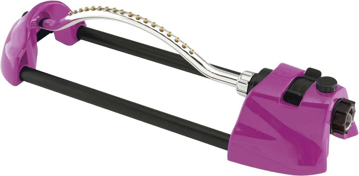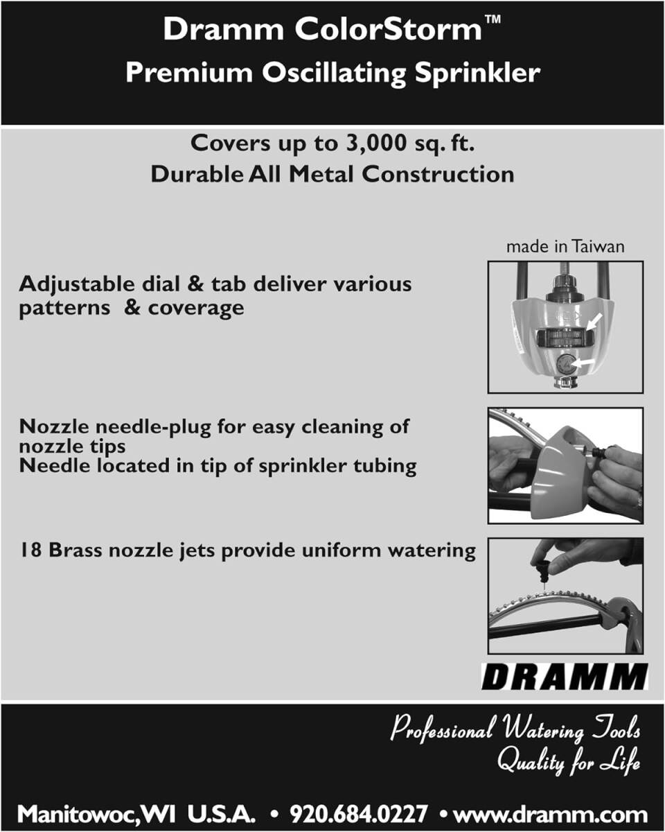The ColorStorm Oscillating Sprinkler has 18 brass nozzle jets to provide uniform watering and includes a needle-plug for easy cleaning of the nozzle jets. The adjustable dial and tab deliver various water patterns and spray distances for lawn care and kid’s water fun. This sprinkler covers an area of up to 3,036 Sq. Ft. (66 ft x 46 ft) and is constructed of heavy-duty metal and brass for durability. The ColorStorm Oscillating Sprinkler’s sleek design and eye-catching color accent your lawn while providing even watering. Any of the ColorStorm Oscillating Sprinklers can be color coordinated with Dramm’s ColorStorm Premium Rubber Hose.