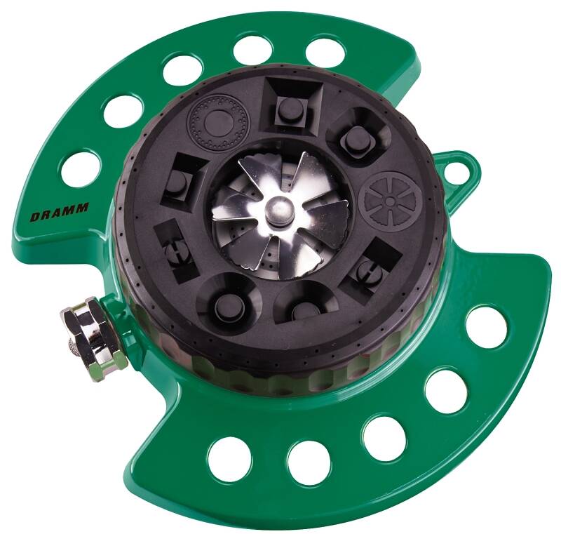 The ColorStorm Turret Sprinkler features 9 water patterns, perfect for lawn and garden care, plus great for kids. Allows the flexibility to only water the area you need. Works for small and large yards. This popular tool has a durable, heavy-duty metal base with a molded hook for easy storage. Accent your lawn with superior design and function with this sprinkler.