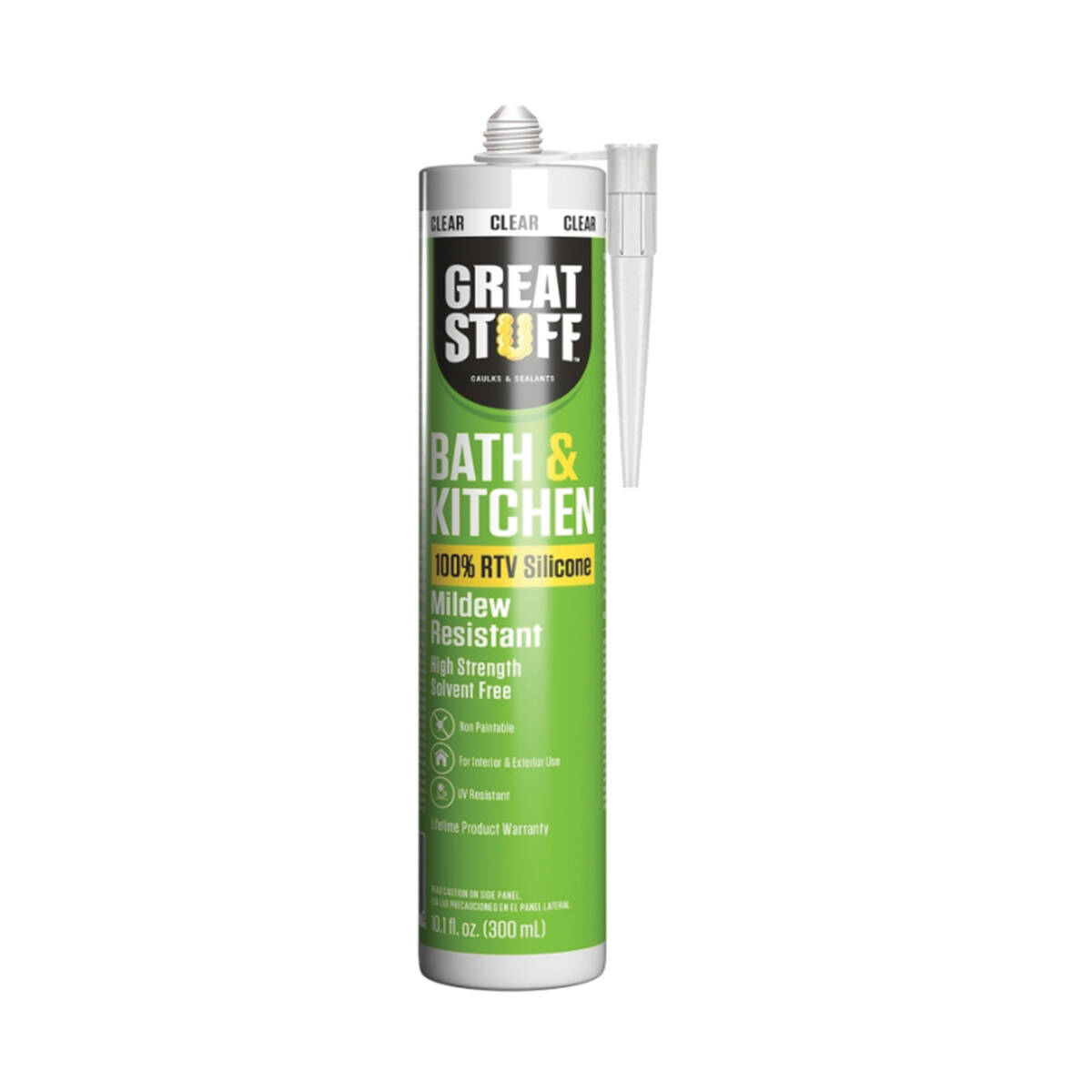 GREAT STUFF Caulk, Net Content: 10.1 fl-oz, Cartridge, Base Material: Silicone, Odor/Scent: Acetic acid, Clear, Compositions: Silica, Amorphous, Fumed, Crystalline-Free, Density: 1.02 g/cc, Application Temperature: Up to 180 deg F, Curing Method: Humidity, 24.24 linear ft Coverage Area, Indoor/Outdoor: Indoor, Outdoor, Dry to Touch: 20 min, Resists: Mildew, UV, Water, Paintable: No, Application Method: Caulk Gun, Applicable Materials: Fiberglass, Glass, Metal