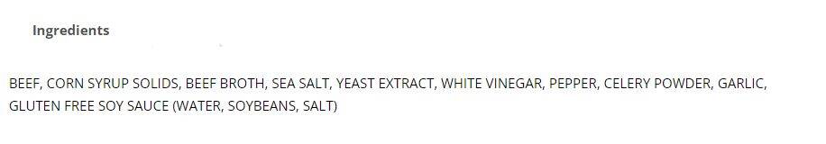 Ingredients Beef, Corn Syrup Solids, Beef Broth, Sea Salt, Yeast Extract, White Vinegar, Pepper, Celery Powder, Garlic, Gluten Free Soy Sauce (Water, Soybeans, Salt)