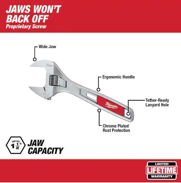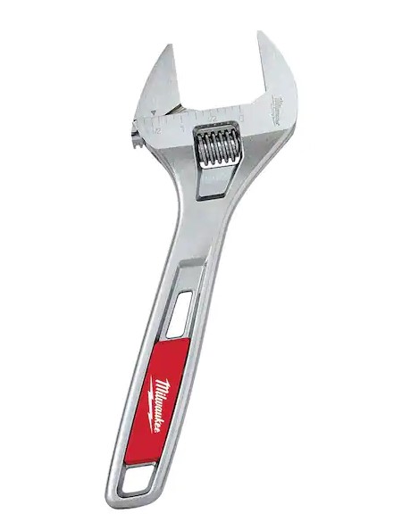 Milwaukee 48-22-7508, 8” Wide Jaw Adjustable wrench has been designed from the ground up to offer maximum productivity to the professional user. The 8” Wide Jaw adjustable wrench features a wide jaw design for increased capacity in confined environments as well as a proprietary adjustment screw for jaws that won’t back off. The ergonomic handle form has been designed for maximum comfort and won’t dig into the palms, and is chrome plated for rust protection and maximum tool life. The wrench’s parallel jaw design won’t slip or damage finish surfaces, and a tether-ready handle loop makes the Milwaukee 48-22-7508 perfect for the toughest of jobsites. Milwaukee stands behind their product and offers a Limited Lifetime Warranty with all adjustable wrenches.