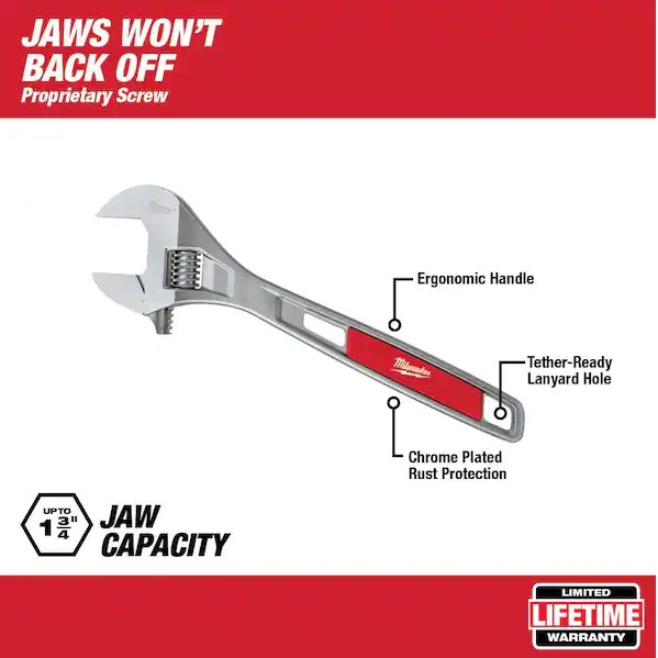 Milwaukee 48-22-7415, 15” Adjustable wrench has been designed from the ground up to offer maximum productivity to the professional user. The adjustable wrench features a proprietary adjustment screw for jaws that won’t back off. The ergonomic handle form has been designed for maximum comfort and won’t dig into the palms, and is chrome plated for rust protection and maximum tool life. The wrench’s parallel jaw design won’t slip or damage finish surfaces, and a tether-ready handle loop makes the Milwaukee 48-22-7415 perfect for the toughest of jobsites. Milwaukee stands behind their product and offers a Limited Lifetime Warranty with all adjustable wrenches.