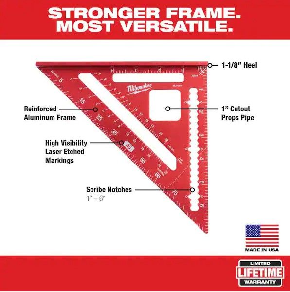 Our 7 in Rafter Square has a stronger frame and is the most versatile rafter square. Scribe notches from 1 in - 6 in allow you to easily and accurately rip lumber. A 1 in cutout in the rafter square helps prop pipe allowing you to cut it more easily on the job site. A reinforced frame gives you more durability on the job site while high visibility laser etched markings make the square easier to read.