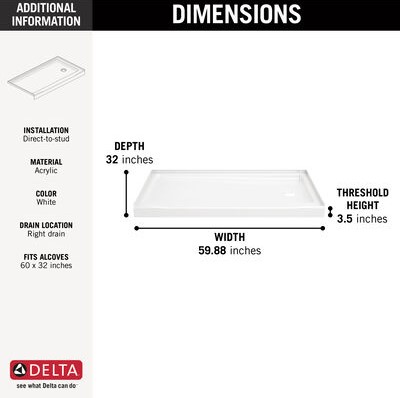 60-Inch X 32-Inch Shower Base Alcove Right Drain White - Classic 500