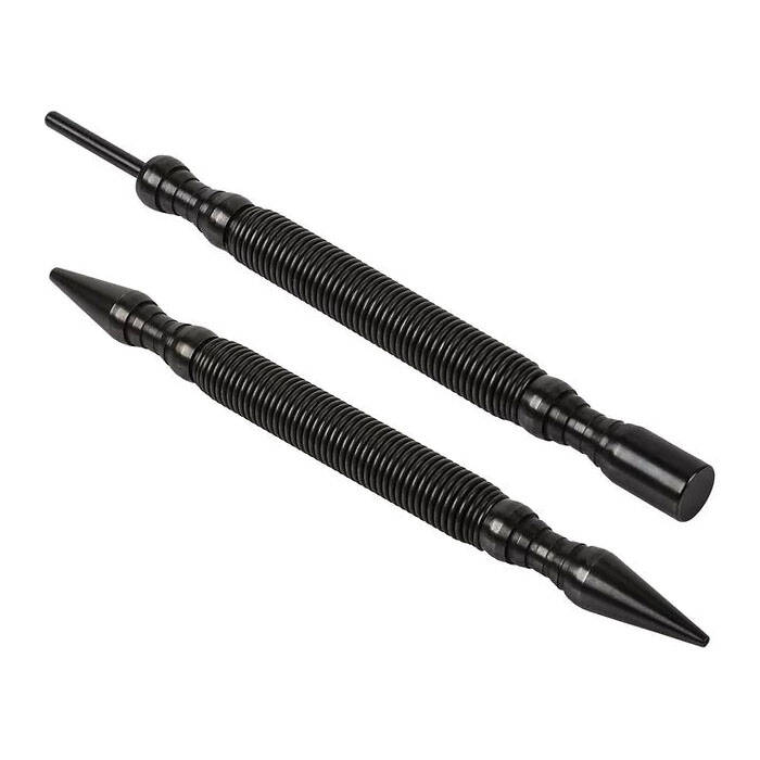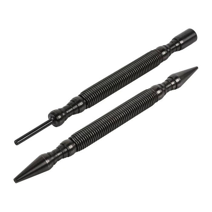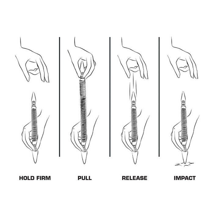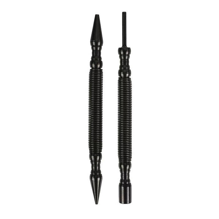 Introducing the HIT Tool pro combo kit includes 1/32 in (#1) and 2/32 in (#2) combination nail setter with door hinge pin punch (2 piece) hammerless spring tool set model #NS12HF. This two pack contains two combination hammerless spring tools. The first dual tipped, spring actuated tool has a 1/32 in nail setter on one end and a 2/32 in nail setter on the other. The second tool has a door hinge pin punch on one end and a steel hammer on the other. The nail sets are designed to efficiently set and countersink finish nails and brads into wood surfaces. The dual headed design features two of the most commonly used sizes for trim and finishing jobs. The door hinge pin punch quickly and effortlessly removes hinge pins from door hinges, while the steel hammer allows for a precise striking force to replace hinge pins without damaging the trim or doors. Utilizing the HIT Tool's patent pending hammerless impact technology, the tools are compact and lightweight yet provide precision accuracy even in tight spaces.