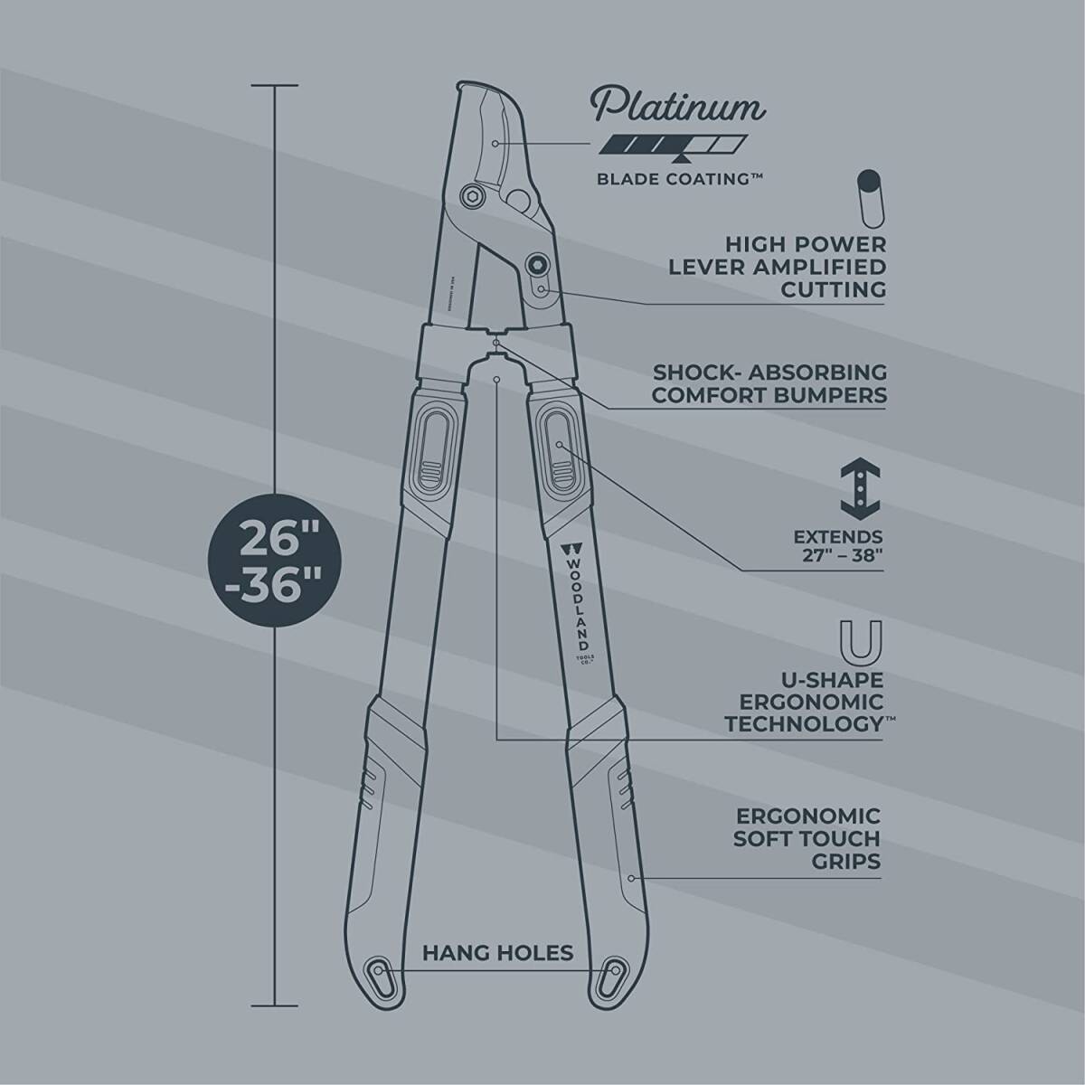 The Woodland Tools 25in-37in Heavy Duty Extendable Lopper is a powerful tool that makes tough cuts easier. It has an advanced blade design, a telescoping mechanism for extended reach, and a comfortable U-shape design with dual-layer soft grips and shock-reducing bumpers.