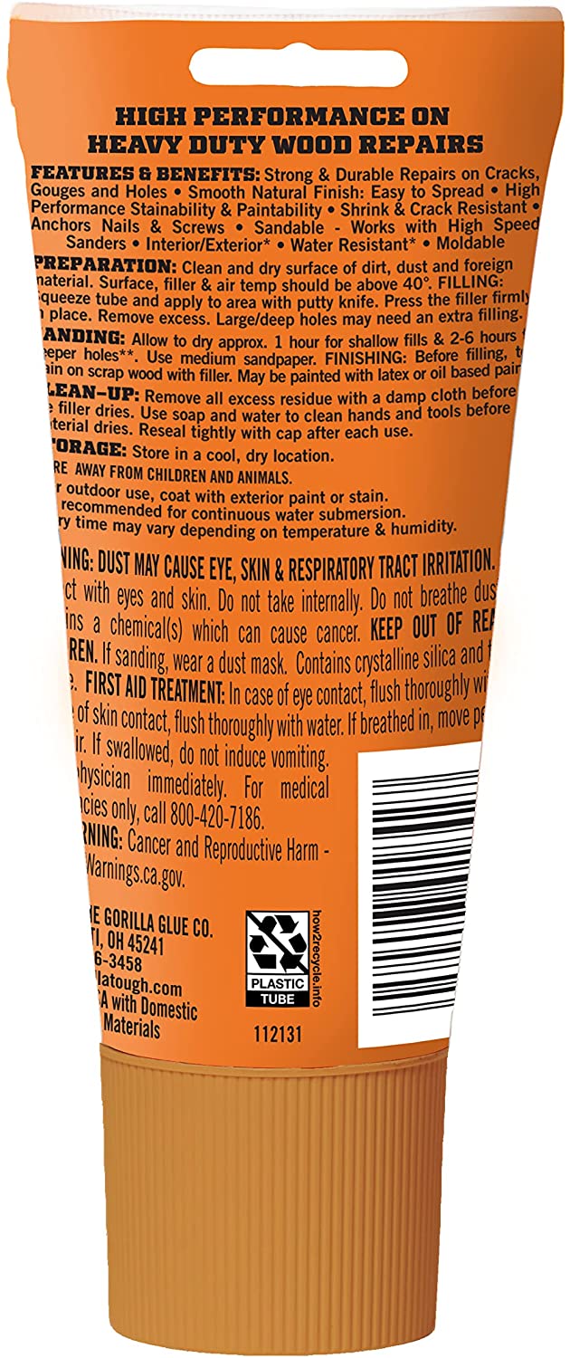 Gorilla High Performance Wood Filler is the go to product for strong, durable repairs on cracks, gouges and holes. The unique formula is easy to spread allowing for a smooth, natural finish. Its high performance stainability, paintability, and sandability provides you with a professional looking finished project!
