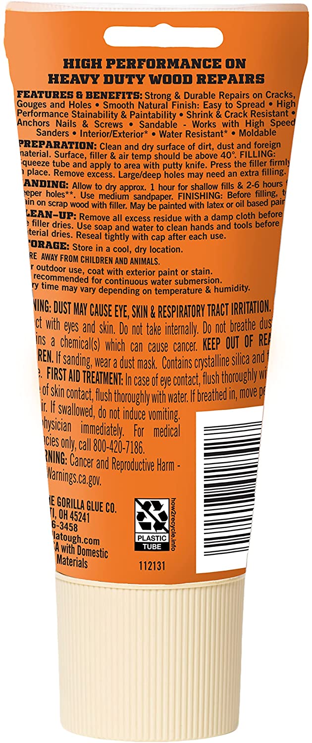 Gorilla High Performance Wood Filler is the go to product for strong, durable repairs on cracks, gouges and holes. The unique formula is easy to spread allowing for a smooth, natural finish. Its high performance stainability, paintability, and sandability provides you with a professional looking finished project!