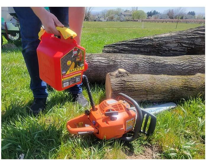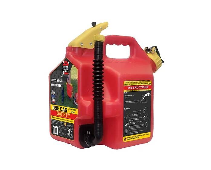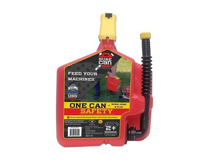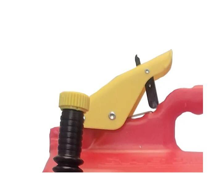 The flexible spout rotates down more than 180 degrees and fits perfectly into any machines fill location while the thumb release trigger on top controls the flow. By pulling straight back on the safety trigger and then down on the thumb button fuel is released immediately while you stay in complete control the entire time. When you notice your fill tank is almost full slowly release the thumb button and allow the excess fuel to drain from the top of the spout before rotating it back up. No more bending over and tipping your fuel can forward and holding it in an awkward position! The SureCan is a high quality fuel dispensing machine!