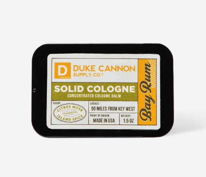 The Bay Rum Solid Cologne has notes of citrus musk, cedarwood, and island spices for a scent that smells like island life 90 miles from Key West, not the pervasive stench found in the east end of South Philadelphia.