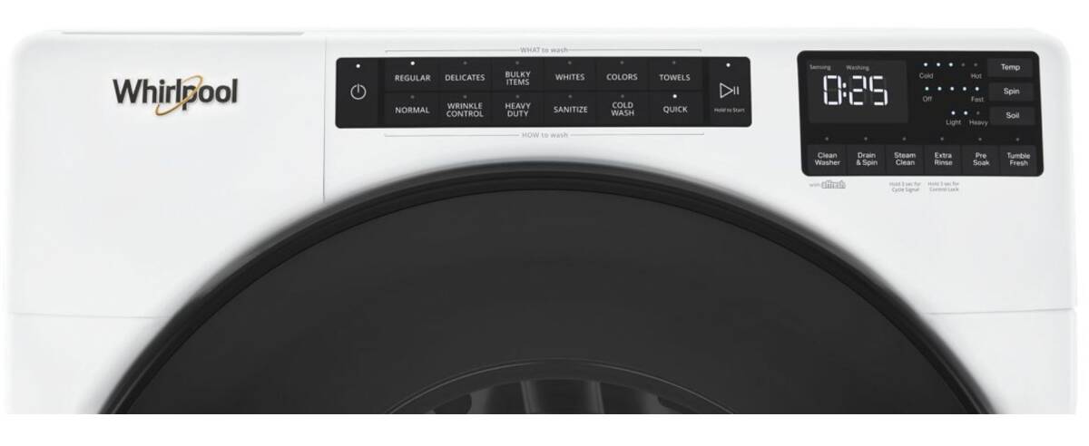 Clean regular-sized loads in as little as 25 minutes in this large capacity front load washer.* Get help removing everyday stains with the washing machine Steam Clean Option. The Tumble Fresh Option keeps clean clothes fresh up to 12 hours after the wash cycle ends. And with the washing machine Sanitize Cycle, increased water temperature sanitizes items like towels.