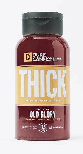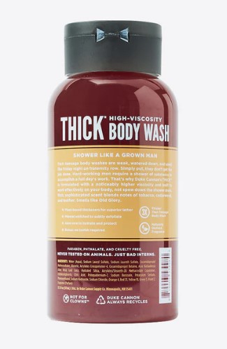 Hard-working men require a shower of substance to accomplish a full day's work. That's why Duke Cannon's THICK is formulated with a noticeably higher viscosity and built to work effectively on your body, not spew down the shower drain.