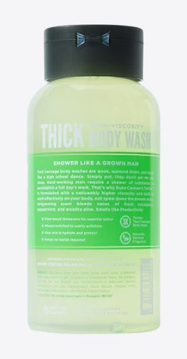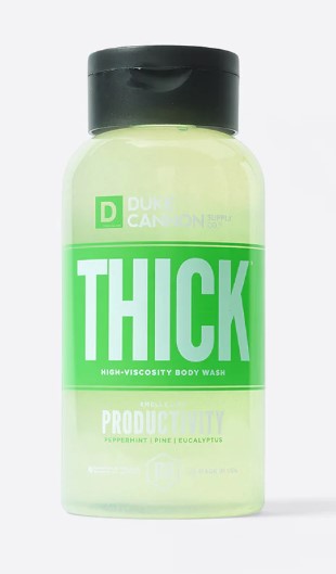 Hard-working men require a shower of substance to accomplish a full day's work. That's why Duke Cannon's THICK is formulated with a noticeably higher viscosity and built to work effectively on your body, not spew down the shower drain.