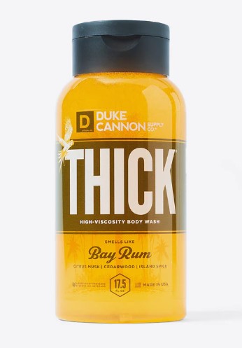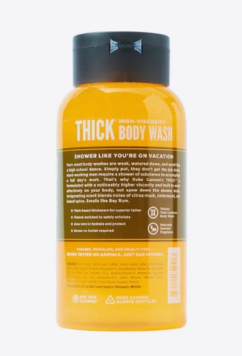 Hard-working men require a shower of substance to accomplish a full day's work. That's why Duke Cannon's THICK is formulated with a noticeably higher viscosity and built to work effectively on your body, not spew down the shower drain.