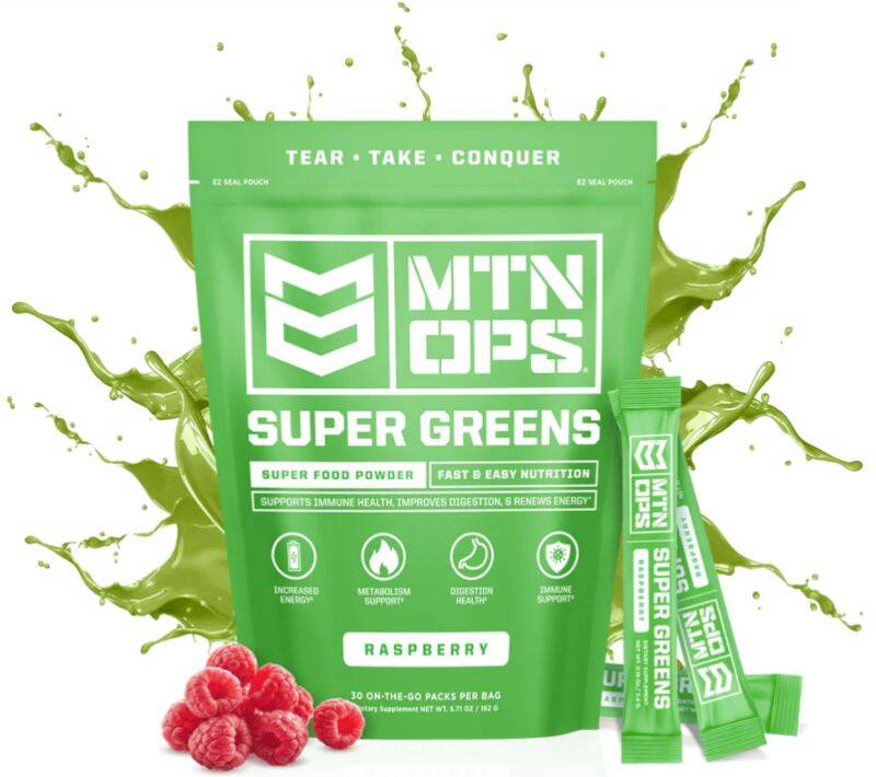Super people deserve super nutrients - MTN OPS SUPER GREENS Stick Packs provides a unique blend of organic greens to deliver on-the-go natural energy, improve skin health and strengthen your immune resistance, all while boosting metabolism and improving overall digestion and gut health. SUPER GREENS™ employs chlorophyll-rich greens that are harvested young and then quickly preserved to deliver optimal nutrition and quality. SUPER GREENS™ mixes perfectly with cold water or your favorite protein smoothie for a well-rounded and extremely nutritious meal.