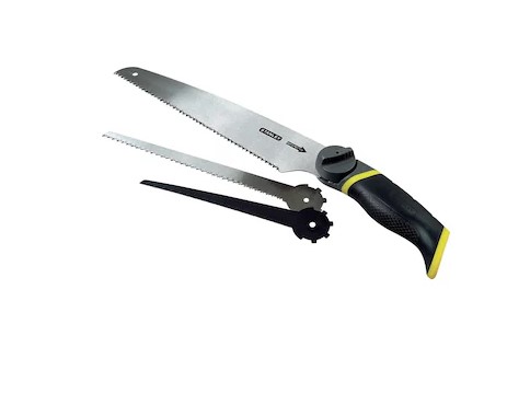 Handle is made with glass-filled, high-strength nylon to support six different blade positions. Turn knob lets user store all three blades, switch blades and tilt each blade. No tools required for blade change. Multiple-position handle allows access to tight corners. Includes three blades, 10 in universal blade cuts on the pull stroke, 8 in compass saw blade and 6 in metal cutting blade. Weighs 0.655 lb.