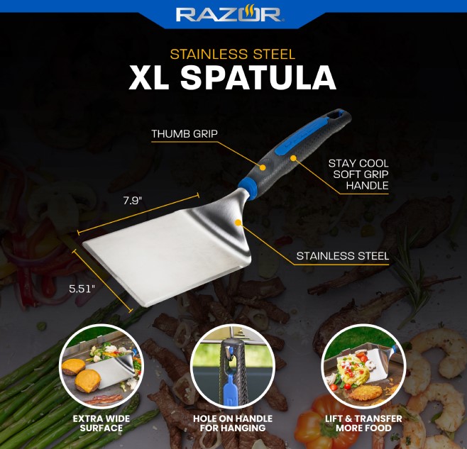 No food is too big for the RazorĀ® stainless steel el spatula! The extra wide surface with beveled edges ensures that you can easily scoop and flip your food without making a mess. The stay cool thumb grip handle helps to keep your hands safely away from the heat of your griddle while giving you a comfortable way to hold your spatula. Includes a hole in the handle for simple hanging and storage when not in use.