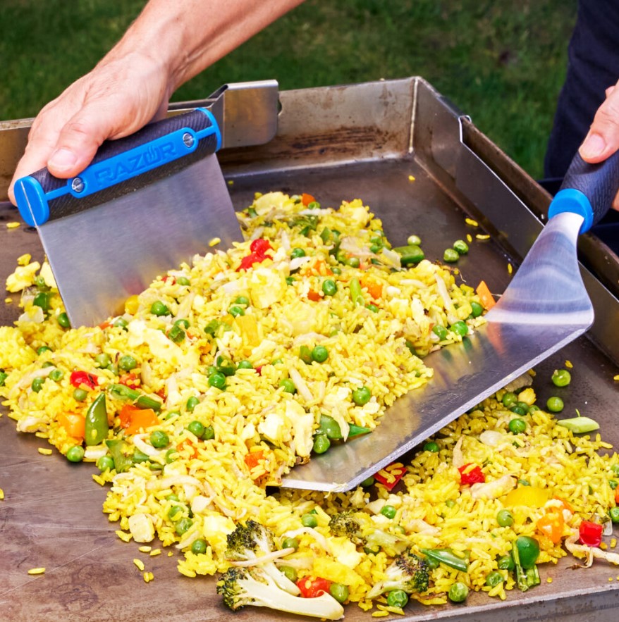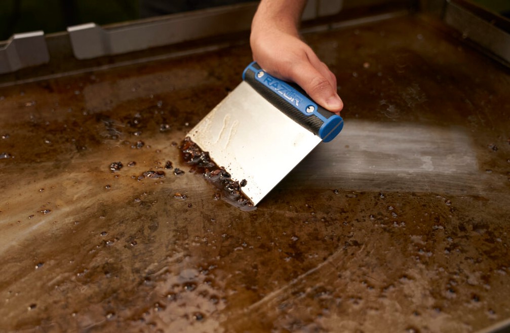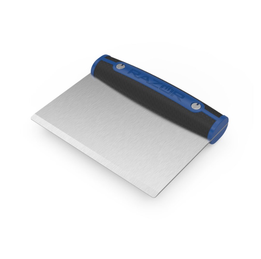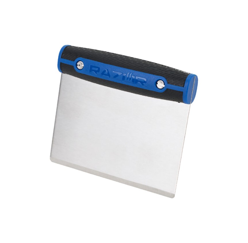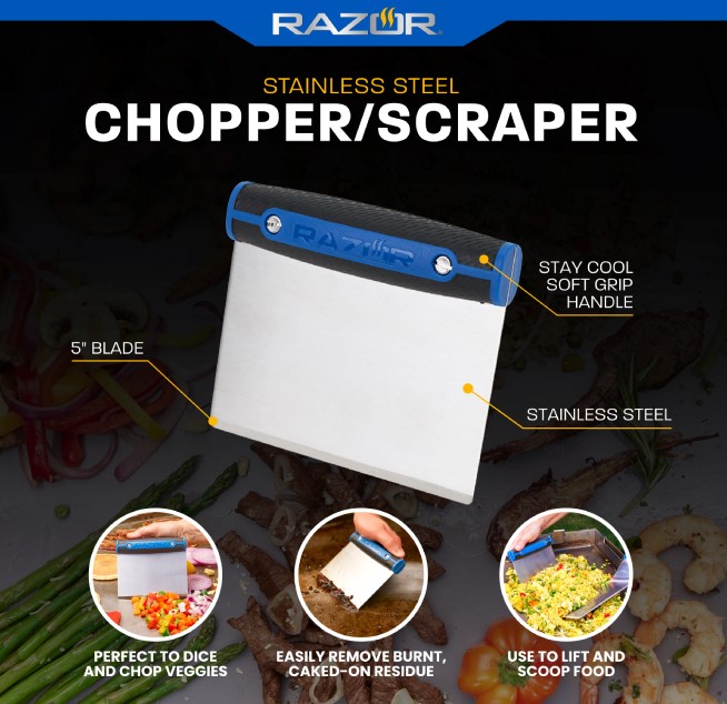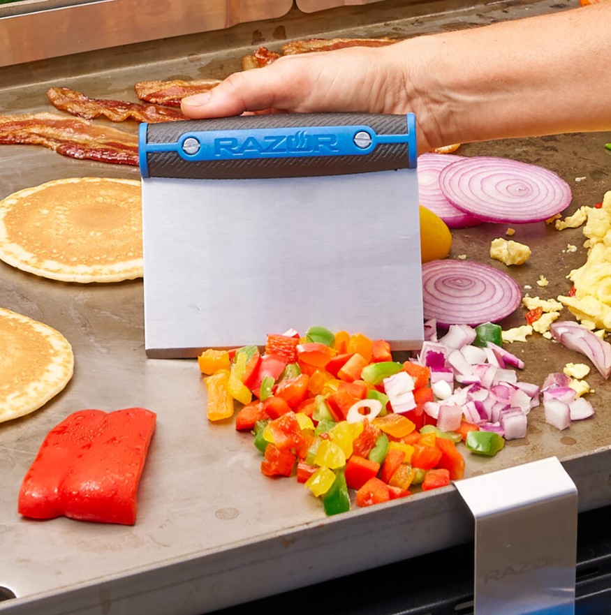 Designed to easily remove burnt-on, caked-on residue, the Griddle Scraper by RazorĀ® has everything needed to maintain a clean griddle for a long time. Sharpened stainless steel blades evenly and thoroughly clean griddle cooking surfaces. Comfortable handle with no-slip soft grip makes chopping and scraping easy.