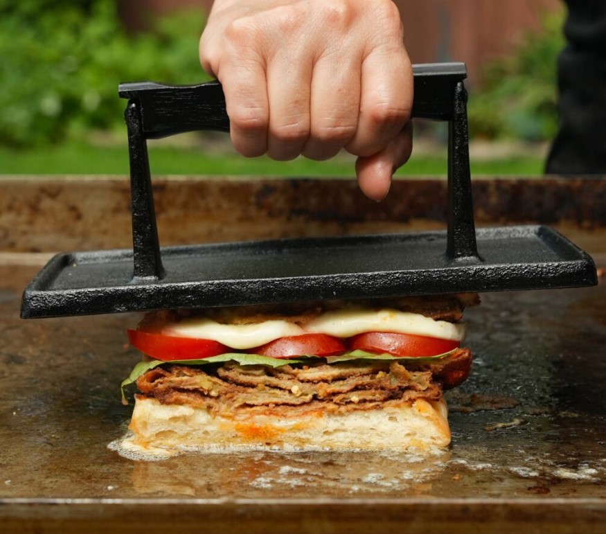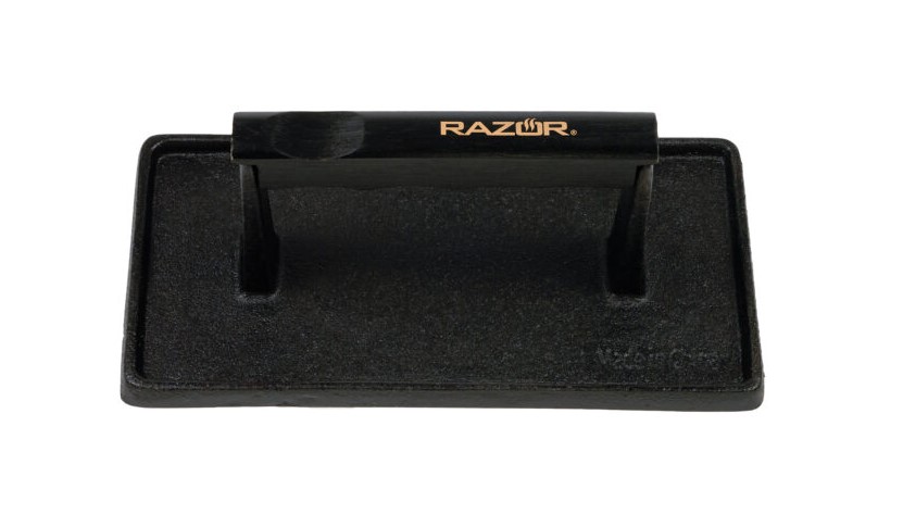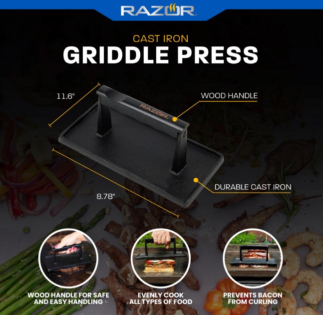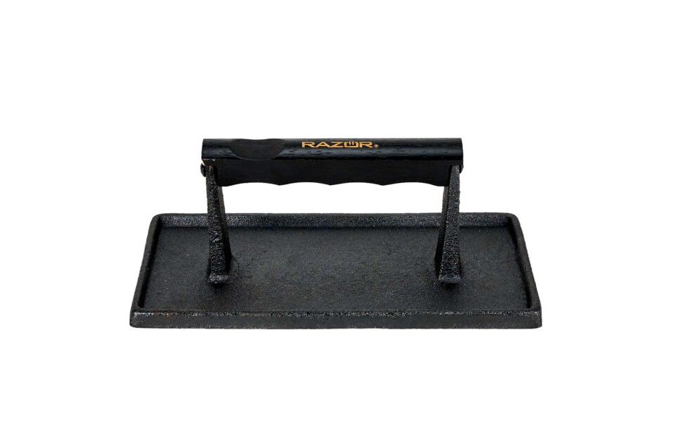The RazorĀ® cast iron griddle press is a sure-fire way to get perfect bacon every time. Made of durable cast iron, the stay cool wooden handle keeps your hands safe from the heal while grilling and makes the press easy to handle. Use to help even cooking in meat, pork, and sandwiches so you get the best flavor from your griddle. Bacon is no match for this press, so keep it from curling for all of its crispy goodness.