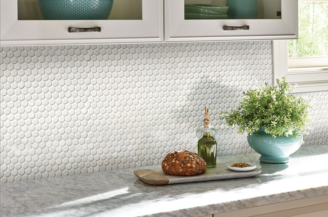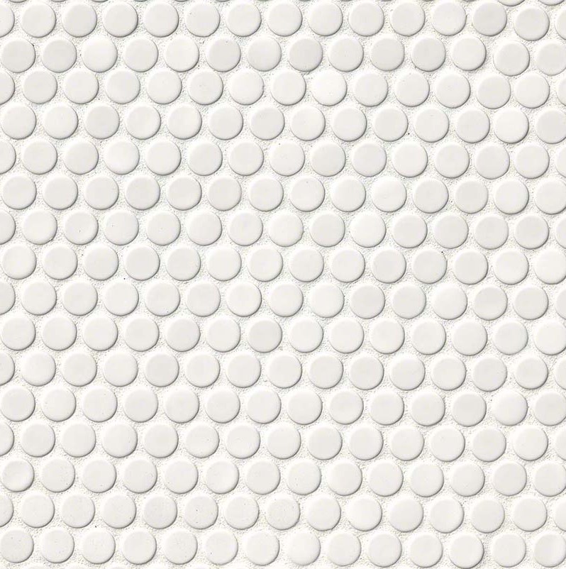 White Glossy Penny Round Mosaic are porcelain mosaic wall tiles with a retro feel. The white penny round pattern with glossy finish can be more dramatic with a contrasting grout or textural with grout in the same color. This backsplash tile is Greenguard Indoor Air Quality Certified® for peace of mind and perfect for residential and commercial flooring as well as residential countertops and wall applications. They also pair well with a wide variety of subway tile, arabesque tile, or ceramic wall tile from MSI's inventory.