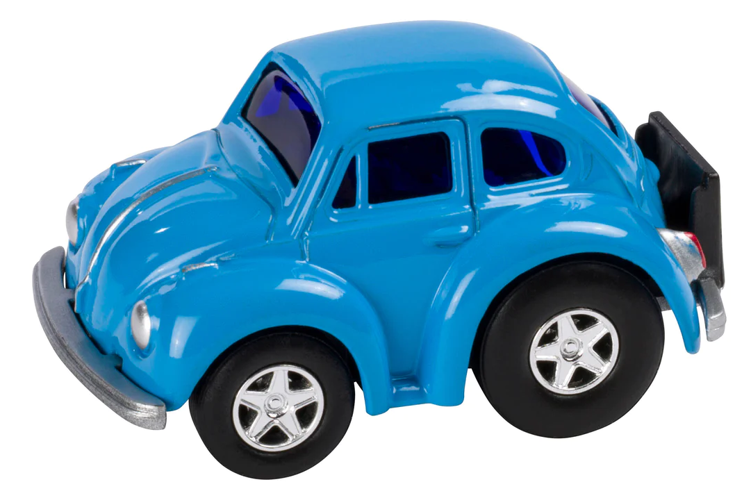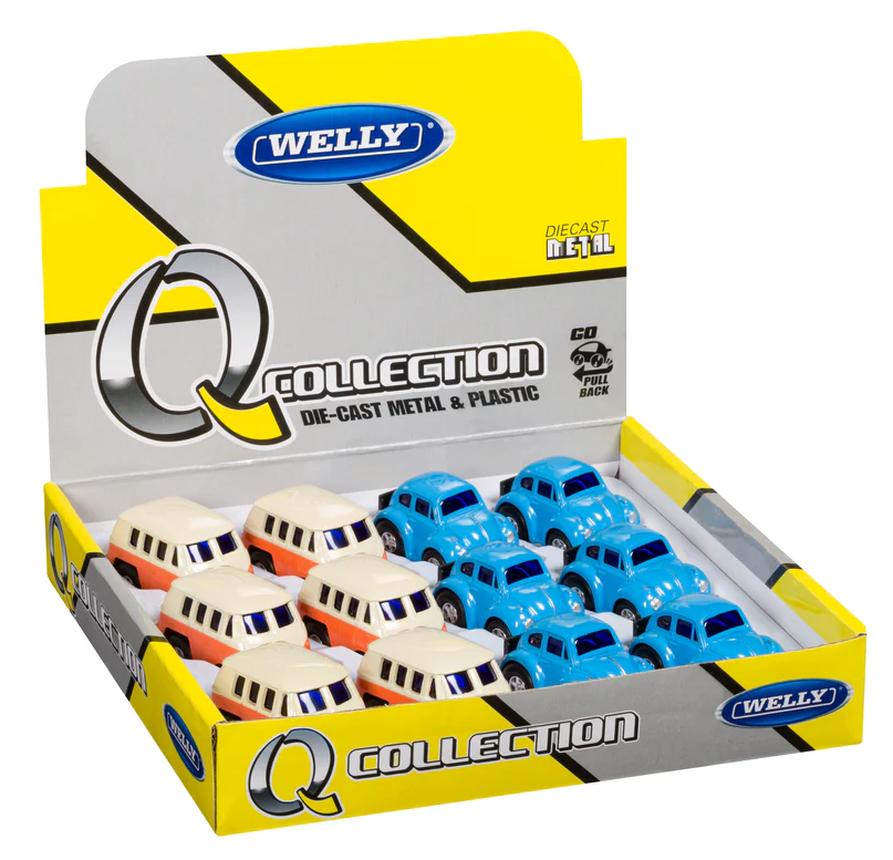 Modeled off classic Volkswagen models, this Welly Q Collection of miniature toy cars includes 2 Volkswagen vehicles. A display case holds 6 bright blue VW Beetles and 6 orange and beige VW vans. Both have black wheels and windows. These tiny 2-inch-long toy cars are made with high-quality die-cast metal and plastic materials. Each one has pull-back motion for immediate driving action.