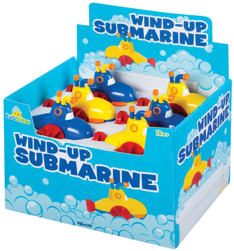 Discover the fun of submarine travel with this 5.50 inches wind-up bath toy. Two assorted colors. 18 months and up