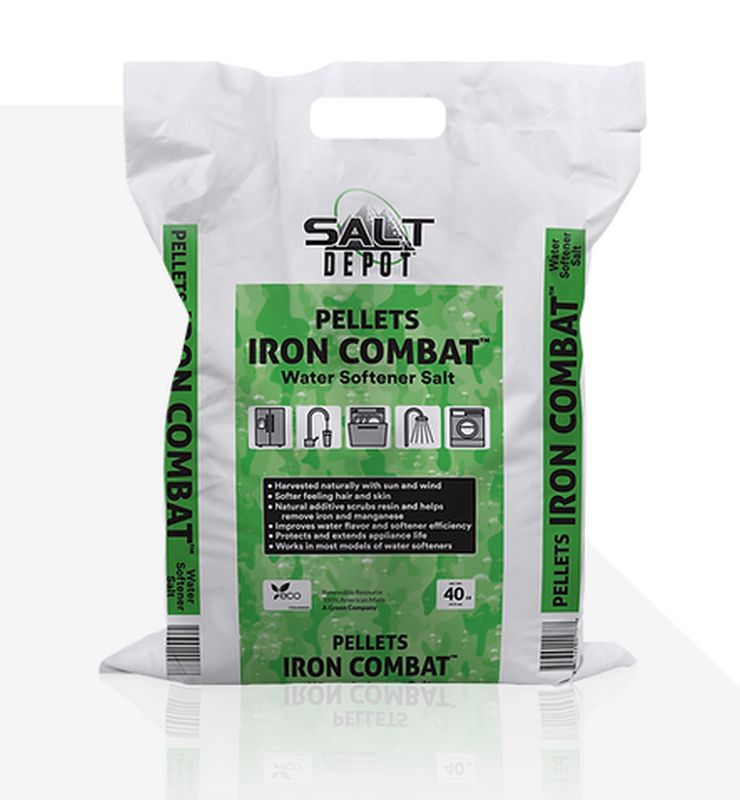 Iron Combat Solar Pellets remove rust and manganese from the water, and contain an all-natural scrubbing resin cleaner. Made from all natural, unbleached salt from the Great Salt Lake, Iron Combat is especially effective for very hard water. We recommend 1 bag of Iron Combat Pellets for every 6 bags of other water softener products to maximize the efficiency of your softener.